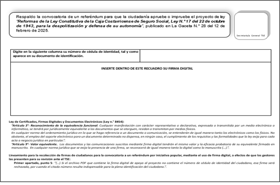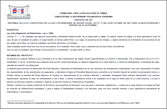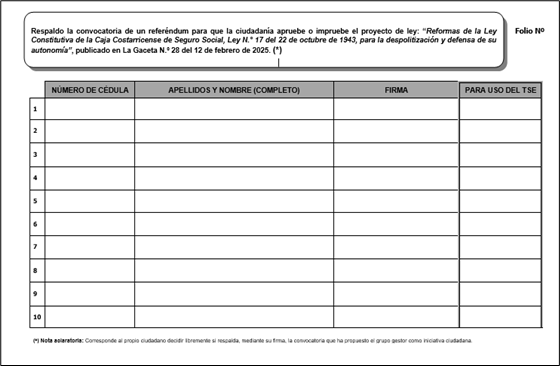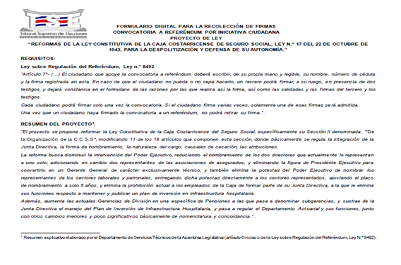 1. Mediante resolución n.° 0441-E9-2025 de las 10:30 horas del 29 de enero de 2025, este Tribunal autorizó la recolección de firmas solicitada por el señor Walter Muñoz Céspedes y otros ciudadanos con el propósito de someter a referéndum, por iniciativa ciudadana, el proyecto de ley denominado “REFORMAS DE LA LEY CONSTITUTIVA DE LA CAJA COSTARRICENSE DE SEGURO SOCIAL, LEY N.° 17 DEL 22 DE OCTUBRE DE 1943, PARA LA DESPOLITIZACION Y DEFENSA DE SU AUTONOMIA”. Esa resolución precisó las reglas que rigen el proceso de recolección de firmas, ordenó la publicación del proyecto de ley en el diario oficial La Gaceta y giró instrucciones a la Dirección General de Registro Electoral y Financiamiento de Partidos Políticos (en lo sucesivo, DGRE) para que diseñara los formularios oficiales (físico y digital) requeridos para la recolección de firmas autorizada (folios 200 a 206).