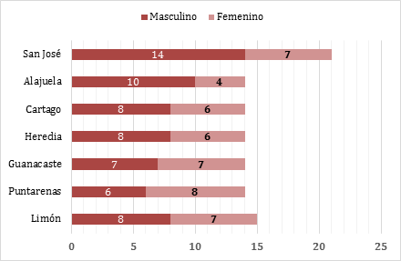 Al analizar los encabezamientos de las listas partidarias desde una perspectiva de distrito electoral o provincia, se observó también la misma tendencia de múltiples elecciones anteriores a encabezar con hombres las listas de los distritos electorales de mayor magnitud, como San José y Alajuela, evidenciándose en dichas provincias diferencias de un 34% y un 42%, respectivamente, a favor de los nombramientos masculinos. Por su parte, los distritos electorales de mediana magnitud como Cartago y Heredia mostraron menor diferencia entre los encabezamientos femeninos y masculinos (14% a favor de encabezamientos masculinos). Finalmente, dentro del grupo de distritos de baja magnitud -y contrario a los distritos de mayor magnitud- uno de ellos no presentó diferencia alguna en cuanto al género de los primeros lugares (Guanacaste), otro presentó una diferencia mínima a favor de encabezamientos masculinos (Limón), y el otro presentó una mayor diferencia, pero a favor de los encabezamientos femeninos (Puntarenas). Lo anterior evidencia que si se analiza la paridad de género por localidad, a pesar del aumento de las mujeres en los encabezamientos de las listas y la representación real en el congreso tras las elecciones de 2018, existe un continuismo respecto a la acumulación de la mayor parte de los encabezamientos masculinos en los distritos electorales de mayor magnitud y una tendencia a dejar los encabezamientos femeninos para los distritos de menor magnitud.