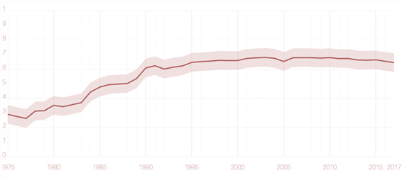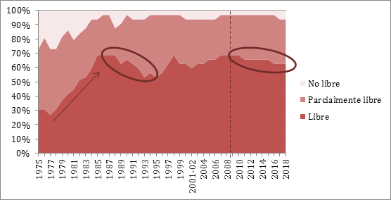 Figura 6. Porcentaje de regímenes libres en América Latina (1975-2018). Elaborado con datos de Freedom House.