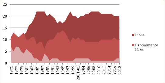 Por último, en cuanto al aumento de libertades, según la clasificación de regímenes políticos de Freedom House, el fin de las dictaduras militares y las guerras civiles trajo consigo una mejora pronunciada en las libertades políticas de la región. Según la clasificación de la misma institución, el número de países catalogados como “libres” aumentó de 8 a 20 desde el inicio de la tercera ola democrática, datos que se representan en la figura 4.